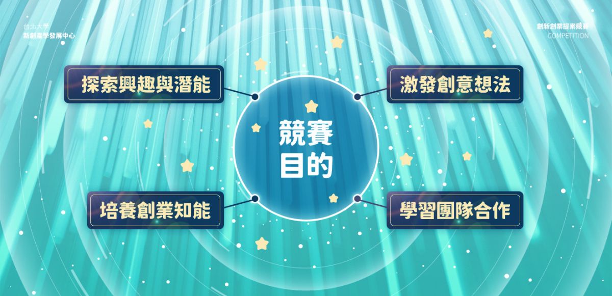競賽目的:為鼓勵學生探索興趣與潛能,激發創意想法,培養創業知能與學習團隊合作,使學生體驗從零開始一步步將創意轉化為創新產品,從中獲得豐富學習經歷,輔以完整輔導機制鏈結創業資源,培育具創新創業精神之人才。