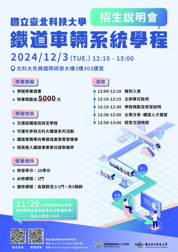 聯絡:北科大智慧鐵道車輛學程辦公室-陳小姐(02-2771-2171分機3843)